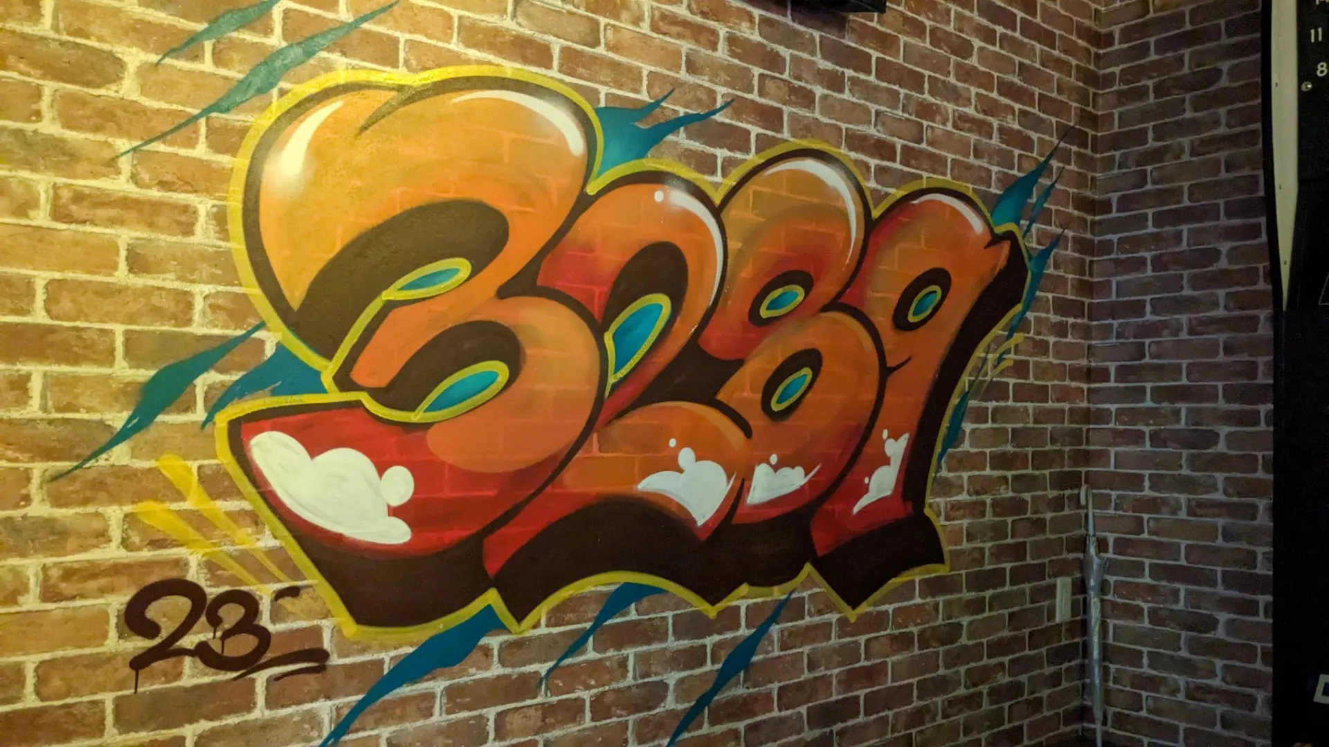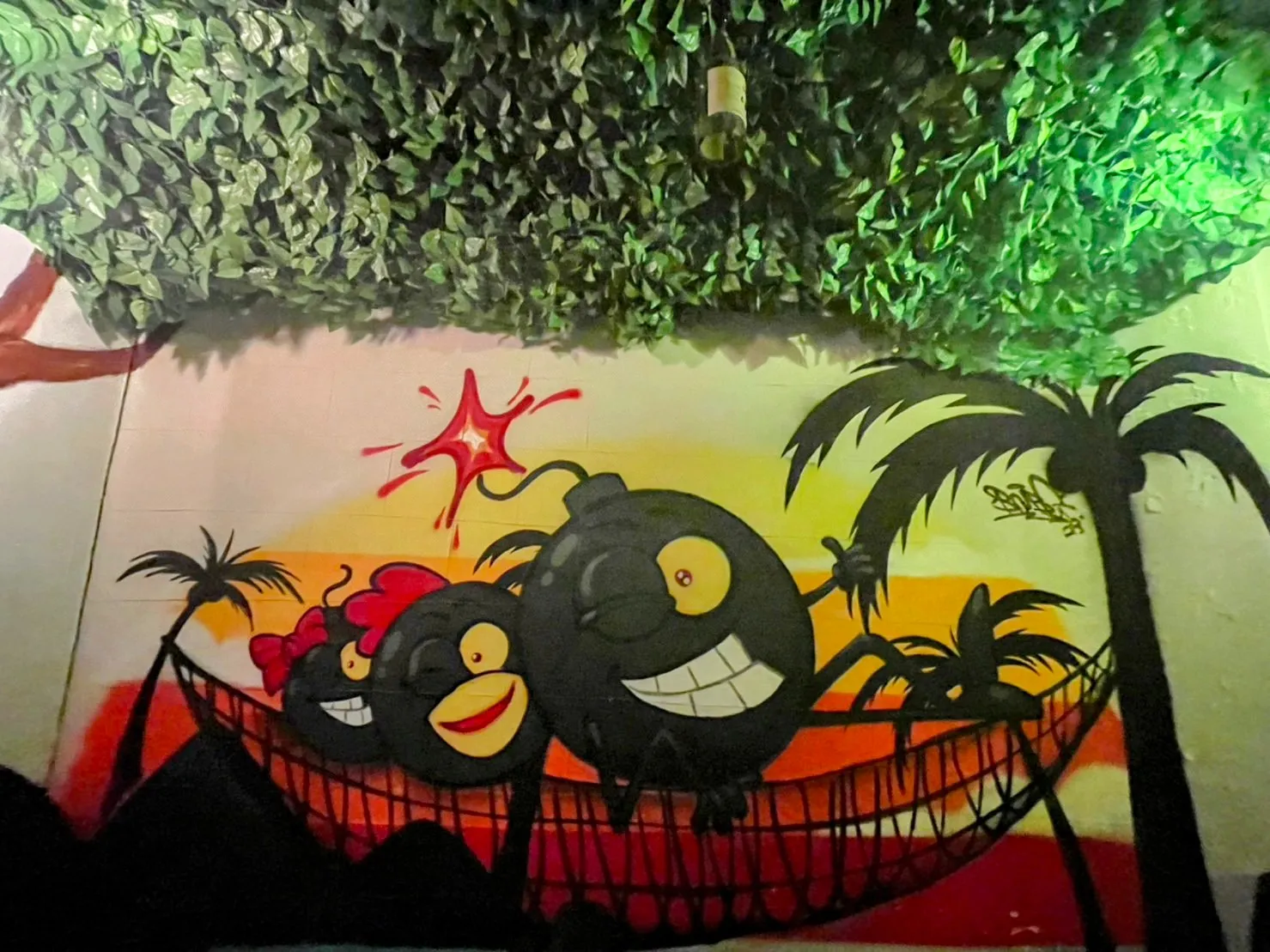 お店の中にも急遽制作してほしいです!と、追加の要望もいただきまして既に営業されているお店のキャラクターであるバクハツ君やトリバクくん、ミニバクちゃんがハンモックに揺られている絵を描かせていただきました!店舗居抜き物件だったらしく前のウォールアートが残っていたのでそれを背景に利用して、活かす形でブラッシュアップしました。店内にも3289のグラフィティアートを施して、今回の案件は終了です!
