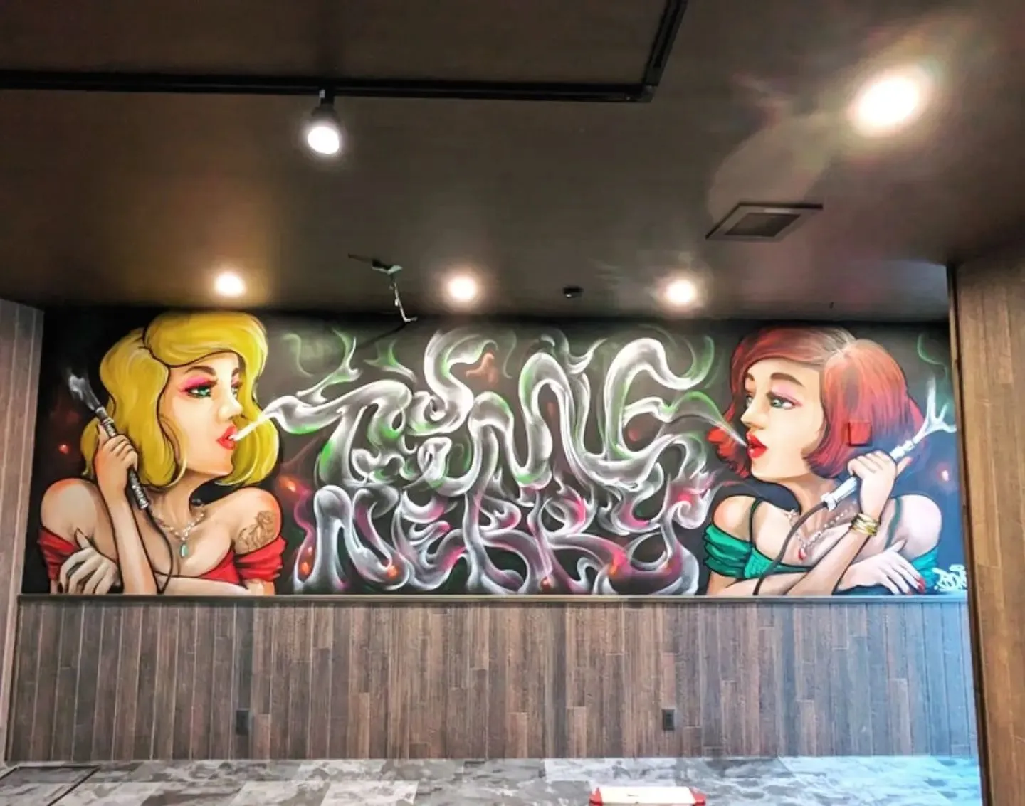 ご依頼されたウォールアートの制作 Size1.7m×6.0m(約10㎡) 福井県小浜市にオープンするシーシャバー『TimeNerry』様からのご依頼で、女性がシーシャを嗜む様子を描きました! 下描きからスプレー1本…