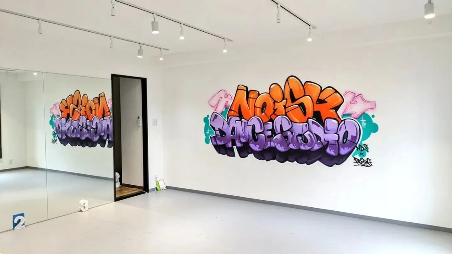 ポップなグラフィティアートで演出!JR六甲道駅近くにあるダンススタジオ@dance.noisyさんにて得意のポップなグラフィティでスタジオを装飾しました!オレンジとパープルの配色でパワフルかつ鮮やかに🟧🟪N…